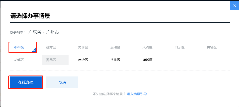 4.办事站点选择“广州市”(请勿选择到区),并根据不同的情形选择具体业务情形,点击“在线办理”。
