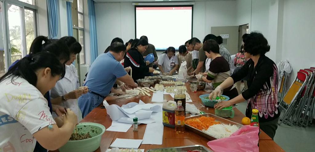 大家来到这个由我们职工从家里带来的锅碗瓢盆、面板及擀面杖组成的“临时厨房”就迅速找到了自己擅长的厨艺点,无需分工,但却处处见到笑容绽放的合作。有人洗菜、有人剁馅、有人调馅、有人揉面、不一会这边是一盆盆诱人饺子馅呈现在大伙面前,那边是一个个面团准备就绪。随后擀面杖出场,饺子皮在巧手们的手下则一张张的“飞”到大家面前,鲜活的饺子也随之一个个的出炉。有韭菜肉饺,玉米肉饺,冬菇木耳肉饺,芹菜肉饺,特别是南校同事们包的“小白菜轻奢艳饺”色香味俱全,堪称饺子里的LV。