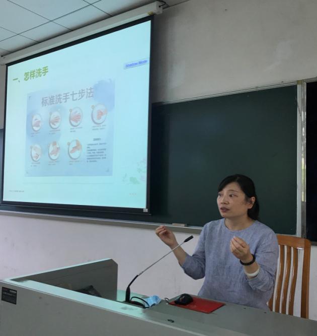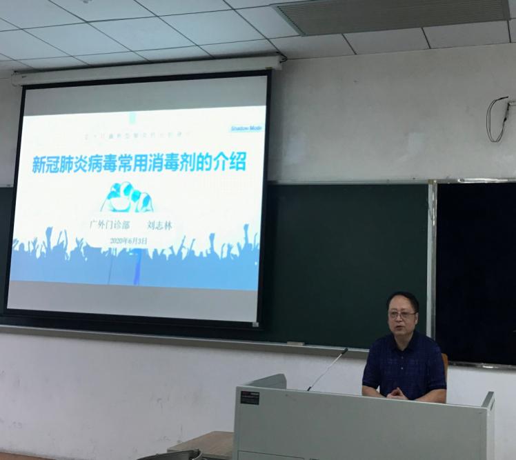 本次培训分两场同时进行。一场设在南校区教学楼F座108室,培训首先由门诊部主任刘志林就新冠肺炎病毒常用消毒剂的种类、各种浓度消毒剂的配制及日常物品及场所消毒方法等方面进行了讲解,尤其是对学生返校后的行李消毒,宿舍、饭堂、课室等的消毒方法进行了具体的介绍。随后,门诊部副主任医师张晓洁进行了工作人员基本防护方面的知识讲解,用“内、外、夹、弓、大、立、腕”七字概述了七步洗手法,教大家怎样正确戴口罩,如何使用额温枪,并进行了现场示范。