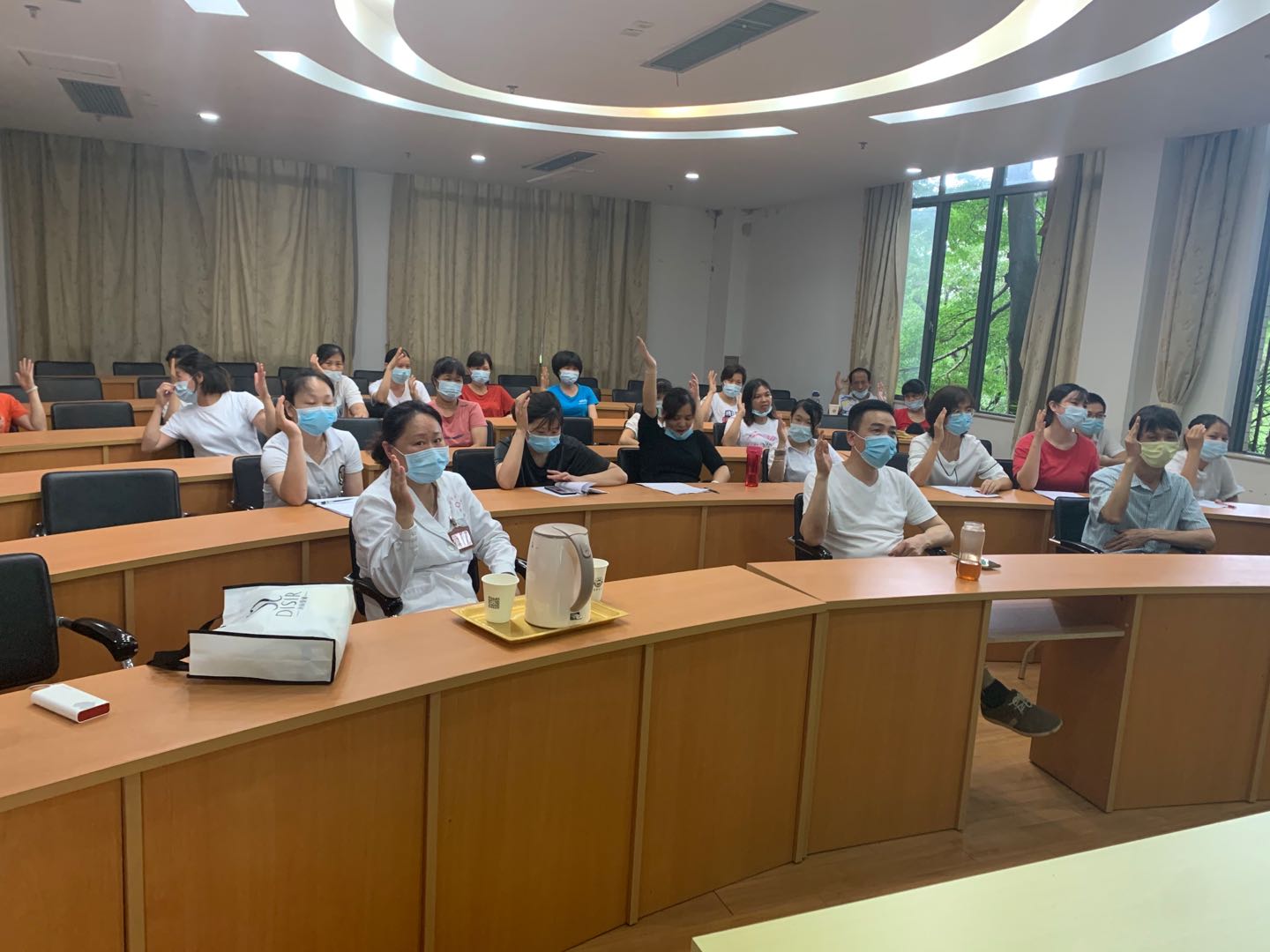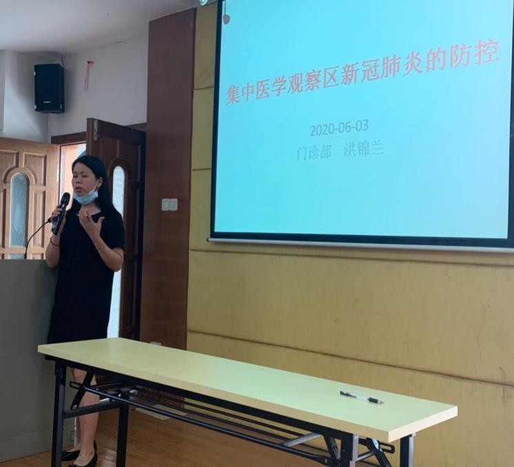 另一场设在南校的医学观察区,培训由门诊部洪锦兰就集中医学观察区新冠肺炎的防控进行了长达2小时的详细讲解和问题解答。洪锦兰结合医学观察区内所涉及的不同场所和不同岗位并结合最新的防控执行标准逐一给员工们进行了深入的讲解,让大家知其然而知其所以然,从而在获得知识的同时也化解了那份焦虑的心理。讲座结束后,门诊部汪俐又利用短短的20分钟给医学观察区工作人员进行了防护用品穿脱和消毒液配置的操作演练。