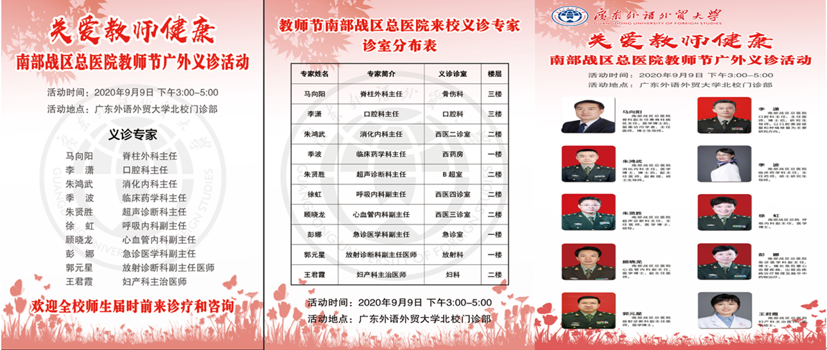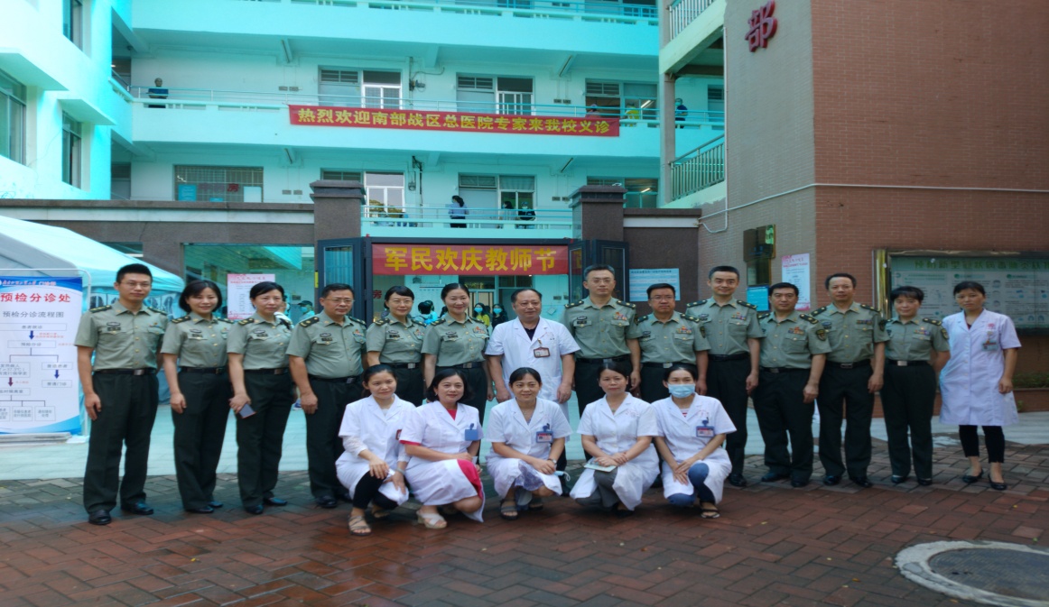 2020年9月9日下午,值第36个教师节来临之际,为关爱教师健康,军民共庆教师节,展示医者情怀,南部战区总医院(原广州军区广州总医院)派出专家团队前来我校慰问师生,并在北校区门诊部举行大型义诊活动,为广大师生“送医、送药、送健康”。
