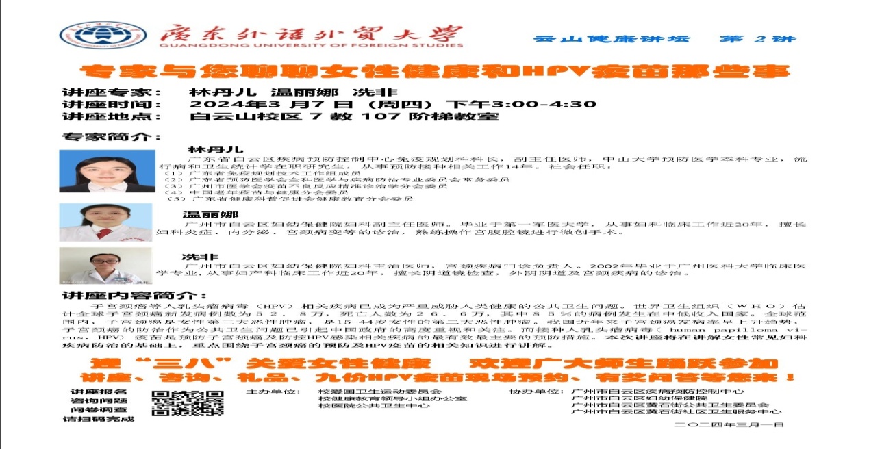 为更好地迎接国际“三·八”妇女节,关爱师生健康、关爱女性健康,在总务后勤部的统一部署下,在学生工作部、教务部、离退休人员工作部等各部门的支持下,我校于3月7日下午在7教水上报告厅举行了“专家与您聊聊女性健康和HPV疫苗那些事”健康讲座。本次讲座为我校云山健康讲坛第2讲,由校爱国卫生运动委员会、校健康教育领导小组办公室及校医院公共卫生中心主办,由白云区疾病预防控制中心、白云区妇幼保健院、黄石街公共卫生委员会及黄石社区卫生服务中心协办。讲座由校医院公共卫生中心副主任洪锦兰主持。