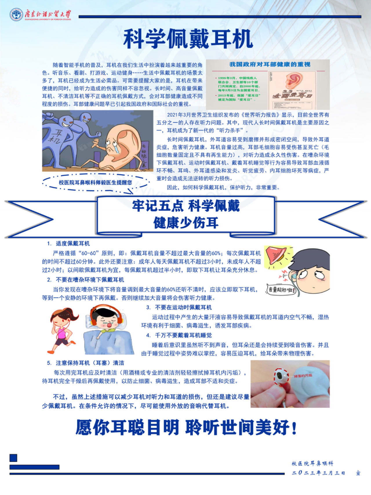 在由广东省卫生健康委联合省科技厅、广东省中医药局、广东省科协共同举办的“广东省第三届健康科普大赛”中,校医院耳鼻喉科师毅主治医师主创参赛作品《科学佩戴耳机》荣获优秀奖。面对现代生活中耳机使用的普及与潜在的听力健康风险,师医生通过科学严谨又贴近生活的科普内容,向公众传递了正确佩戴耳机的关键信息。