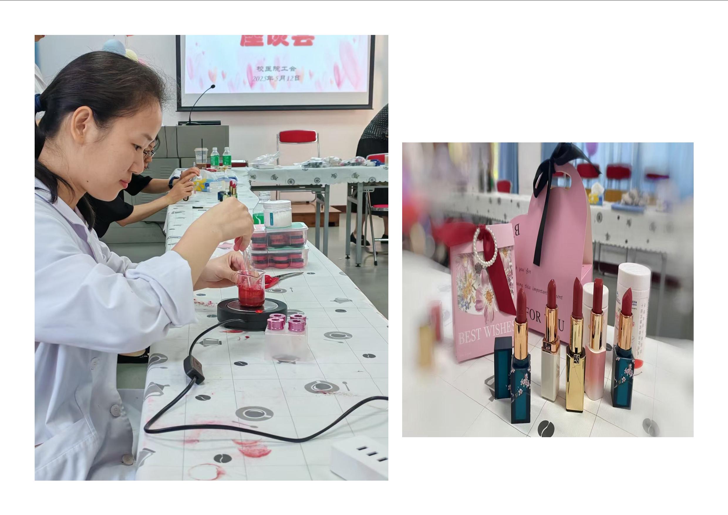 随后开展的口红DIY制作沙龙,由高级营养师刘鸿全程指导。医务人员按4人分组开启创意实践,从精确称量材料,到精心调制色号;从精准控温搅拌溶解,到专注完成注模冷藏。当一支支凝结着巧思的专属口红脱模成型时,参与者在欢声笑语中完成艺术疗愈的独特体验。