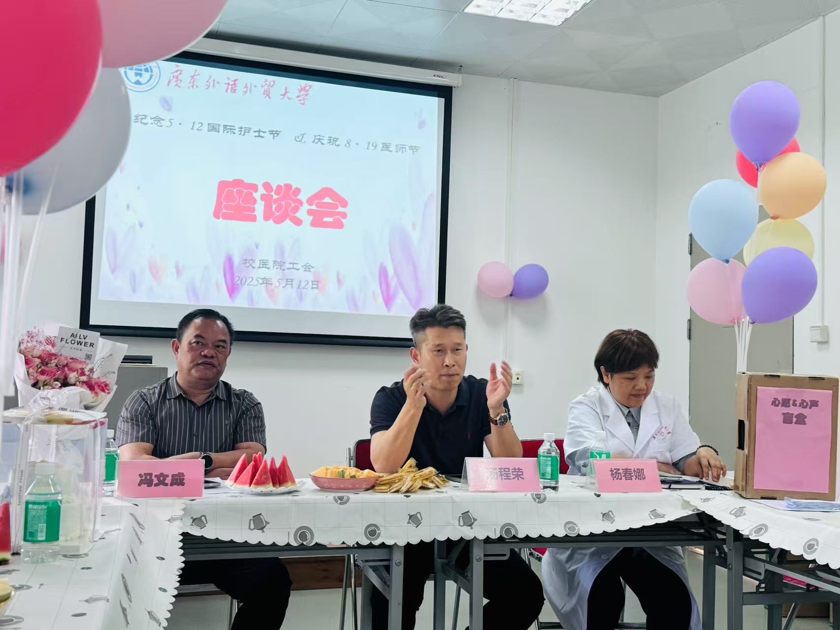 今年是第114个国际护士节,为深入贯彻“关爱护士队伍,守护人民健康”主题精神,校医院工会组织开展系列庆祝活动,向校医务人员致以节日问候。5月12日护士节当天下午,校医院工会在白云山校区校医院会议室举行了节日庆祝座谈会、医务人员礼仪规范培训以及口红DIY制作沙龙。后勤党委书记、部长汤程荣、校医院院长杨春娜、后勤党委副书记冯文成出席了本次活动。护士节前夕,院工会还组织职工代表前往深圳开展学习交流活动。